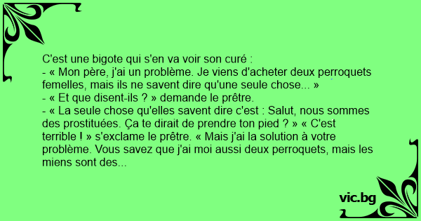 - « La seule chose qu'elles savent dire c'est : Salut, nous sommes des prostituées. Ça te dirait de prendre ton pied ? » « C'est terrible ! » s'exclame le prêtre. « Mais j'ai la solution à votre problème. Vous savez que j'ai moi aussi deux perroquets, mais les miens sont des mâles. Amenez-moi vos deux perroquettes, je les mettrais avec les miens. Comme je leur ai appris à prier et à lire la bible, mes perroquets apprendront à vos perroquettes les bonnes manières. Et ainsi vos perroquettes ne diront plus ces phrases dégoûtantes, mais prieront avec dévotion. »