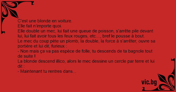 Quand il ne reste quasi plus rien de la bagnole, il se retourne, et voit la blonde toujours franchement écroulée de rire, hilare. Furax, il lui dit :