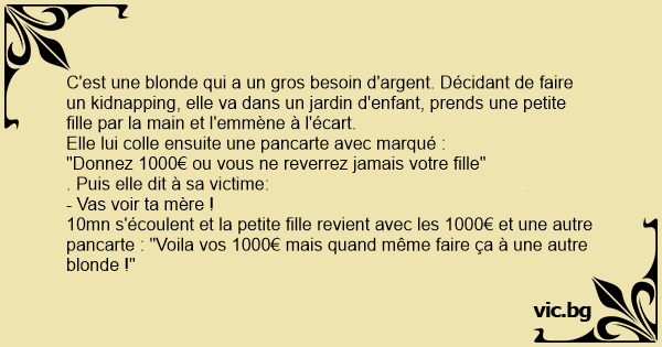 10mn s'écoulent et la petite fille revient avec les 1000€ et une autre pancarte : "Voila vos 1000€ mais quand même faire ça à une autre blonde !"