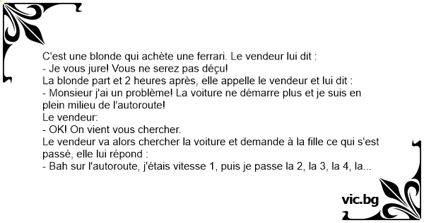 C'est une blonde qui achète une ferrari. Le vendeur lui dit :
