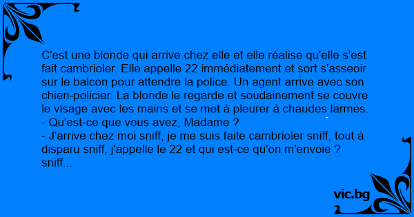 C'est une blonde qui arrive chez elle et elle réalise qu'elle s'est fait cambrioler. Elle appelle 22 immédiatement et sort s'asseoir sur le balcon pour attendre la police. Un agent arrive avec son chien-policier. La blonde le regarde et soudainement se couvre le visage avec les mains et se met à pleurer à chaudes larmes.
