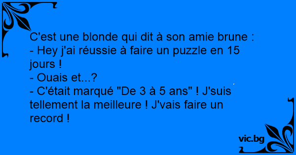 Deux blondes se rencontrent. L'une dit à l'autre: - Tu as l'air bien contente ! - Eh oui! j'ai réussi a faire un puzzle en six mois. - Et qu'y a-t-il d'extraordinaire ? - Sur la boite, c'était...