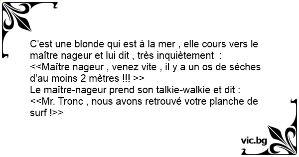 C'est une blonde qui est à la mer , elle cours vers le maître nageur et lui dit , très inquiètement :