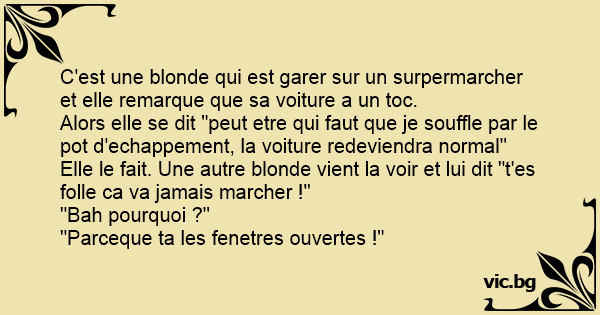 Une blonde souffle dans son pot d'échappement. Une autre blonde arrive et lui dit: - Qu'est-ce que tu fais ? - j'essaye de faire grossir ma voiture - Mais t'es bête ou quoi ça va pas marché - Bah pourquoi ? - Parce que t'as laissé tes fenêtres ouvertes