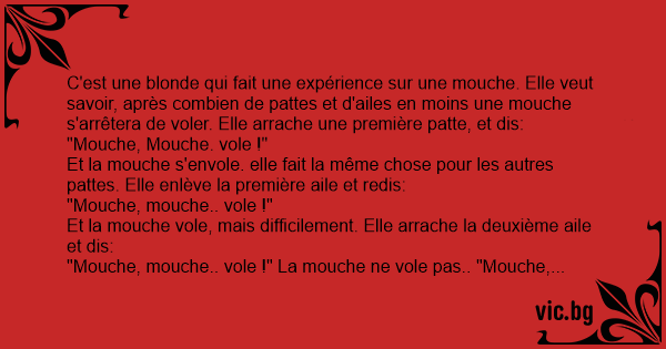 C'est une blonde qui fait une expérience sur une mouche. Elle veut savoir, après combien de pattes et d'ailes en moins une mouche s'arrêtera de voler. Elle arrache une première patte, et dis: