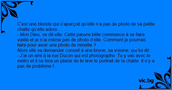 - J’ai un ami à la rue Ducon qui est photographe. Tu y vas avec le métro et il se fera un plaisir de te tirer le portrait de ta сhатте. Il n’y a pas de problème !
