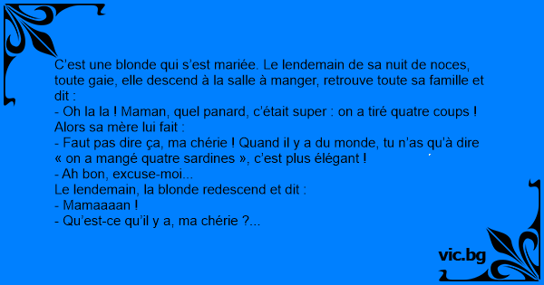 C’est une blonde qui s’est mariée. Le lendemain de sa nuit de noces, toute gaie, elle descend à la salle à manger, retrouve toute sa famille et dit :