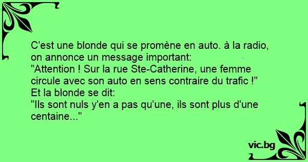 C'est l'histoire d'une blonde qui roule sur une départemental quand elle entend un message radio important: '- Avis aux personnes roulant sur la departemental 2335 une voiture roule en sens...