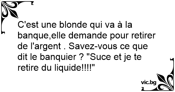 C'est une blonde qui va à la banque,elle demande pour retirer de l'argent . Savez-vous ce que dit le banquier ? "Suce et je te retire du liquide!!!!"