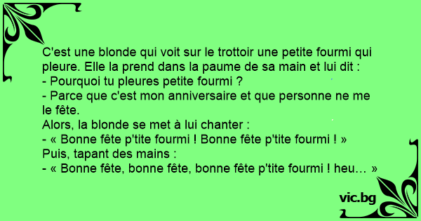 C'est une blonde qui voit sur le trottoir une petite fourmi qui pleure. Elle la prend dans la paume de sa main et lui dit :