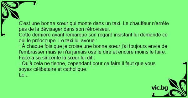 Une religieuse prend un taxi pour se rendre à Dunkerque et constate que le beau chauffeur n’arrête pas de la regarder. Elle lui demande pourquoi il la regarde si intensément. Il répond : - J’ai une...