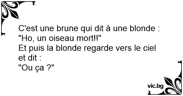 Deux blonde se promènent, soudainement ; l'une s'écrit : - Oh ! Regarde un oiseau mort ! - Où ça ?! Demande l'autre en regardant le ciel.