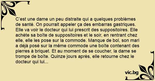 C’est une dame un peu distraite qui a quelques problèmes de santé. On pourrait appeler ça des embarras gastriques. Elle va voir le docteur qui lui prescrit des suppositoires. Elle achète sa boîte de suppositoires et le soir, en rentrant chez elle, elle les pose sur la commode. Manque de bol, son mari a déjà posé sur la même commode une boîte contenant des pierres à briquet. Et au moment de se coucher, la dame se trompe de boîte. Quinze jours après, elle retourne chez le docteur qui lui demande :