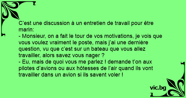 - Monsieur, on a fait le tour de vos motivations, je vois que vous voulez vraiment le poste, mais j’ai une dernière question, vu que c’est sur un bateau que vous allez travailler, alors savez vous nager ?