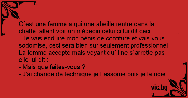 C´est une femme a qui une abeille rentre dans la сhатте, allant voir un médecin celui ci lui dit ceci: