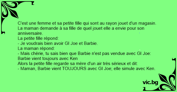 - Maman, Barbie vient TOUJOURS avec GI Joe; elle simule avec Ken.