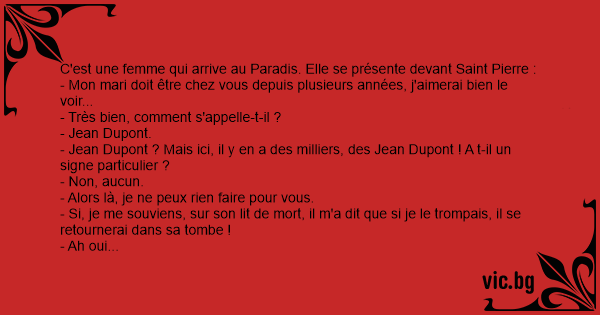 C'est une femme qui arrive au Paradis. Elle se présente devant Sаinт Pierre :