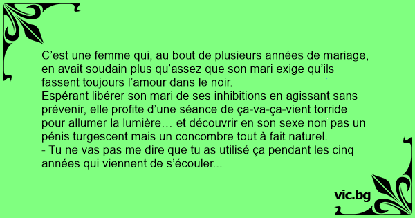 C’est une femme qui, au bout de plusieurs années de mariage, en avait soudain plus qu’assez que son mari exige qu’ils fassent toujours l’amour dans le noir.