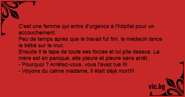 Le 1er Avril, une femme vient d'accoucher Le medecin entre dans sa chambre avec le bébé et sans aucune raison Il le jette par terre lui marche dessus et le jette contre le mur La mère se met à...