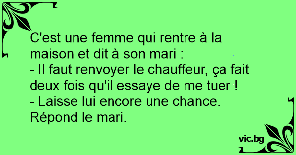 C’est une femme qui rentre chez elle totalement paniqué : - Chéri ! le chauffeur a essayé de me rouler dessus ! Il a voulu me tuer ! Il faut absolument le renvoyer ! - Mais voyons ! Laisse-lui au...
