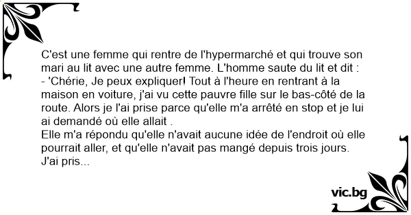 C'est une femme qui rentre de l'hypermarché et qui trouve son mari au lit avec une autre femme. L'homme saute du lit et dit :