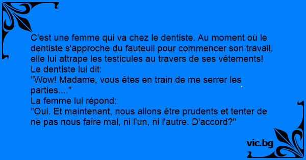Egy nő elmegy a fogorvoshoz. Amikor beül a székbe, megmarkolja a doki férfiasságát. - De hölgyem, ön a nemi szervemet fogja! - Így van, és most mindketten nagyon óvatosak leszünk, hogy ne okozzunk...