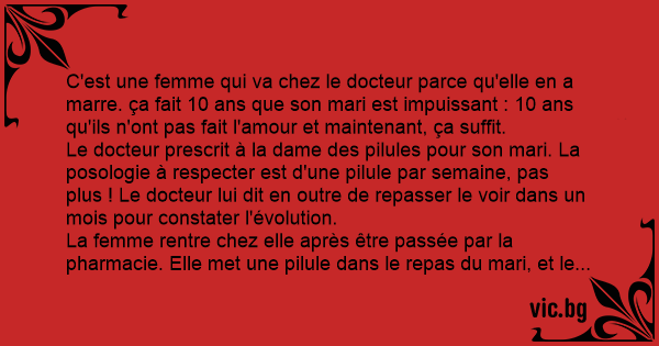 Le docteur prescrit à la dame des pilules pour son mari. La posologie à respecter est d'une pilule par semaine, pas plus ! Le docteur lui dit en outre de repasser le voir dans un mois pour constater l'évolution.