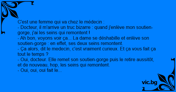 Los senos de la joven en el médico Симпатичная женщина приходит к врачу и говорит: Une très jolie jeune femme va consulter un médecin. Elle lui dit : - Docteur, c'est très bizarre ce qui m'arrive. Quand j'enlève mon soutien-gorge, j'ai les seins qui remontent, systématiquement. -... Млада жена отива на доктор: - Докторе, имам някаква странна болест, като си сваля сутиена и гърдите ми щръкват нагоре. - Дааа - наистина много странно, трябва да видя! Жената свалила сутиена и... Une jolie femme va voir un médecin parce qu'elle a la poitrine qui se redresse au moindre contact. Il lui palpe la poitrine. Il constate qu'en effet ses seins durcissent tout de suite et se... - Domnule doctor, de cate ori imi scot sutienul, mi se ridica sanii si mi se intaresc sfarcurile. - Ia sa vedem! Femeia scoate bluza, apoi sutienul si sanii, zvac in sus! - Fantastic, se minunaa...