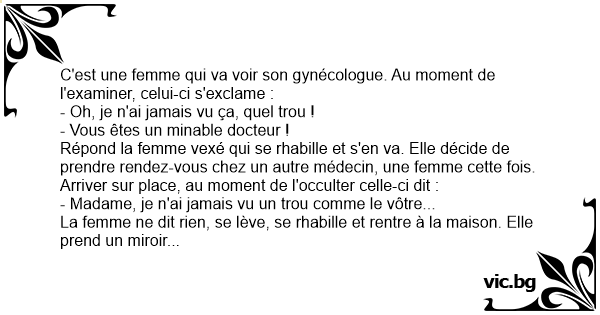C'est une femme qui va voir son gynécologue. Au moment de l'examiner, celui-ci s'exclame :