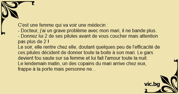 - Docteur, j'ai un grave problème avec mon mari, il ne bande plus.