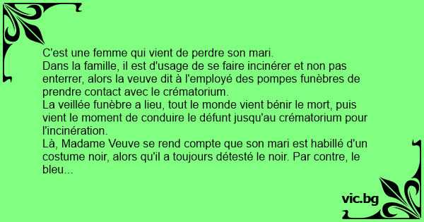 Là, Madame Veuve se rend compte que son mari est habillé d'un costume noir, alors qu'il a toujours détesté le noir. Par contre, le bleu était sa couleur fétiche. Du coup, la veuve s'adresse tout de suite à l'employé du crématorium et lui dit: