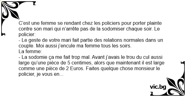 - La sodomie ça me fait trop mal. Avant j’avais le trou du cul aussi large qu’une pièce de 5 centimes, alors que maintenant il est large comme une pièce de 2 Euros. Faites quelque chose monsieur le policier, je vous en supplie.