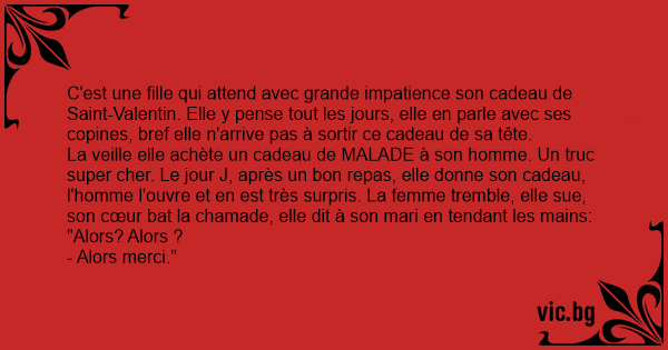 La veille elle achète un cadeau de MALADE à son homme. Un truc super cher. Le jour J, après un bon repas, elle donne son cadeau, l'homme l'ouvre et en est très surpris. La femme tremble, elle sue, son cœur bat la chamade, elle dit à son mari en tendant les mains: