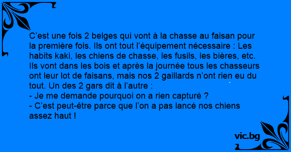 C’est une fois 2 belges qui vont à la chasse au faisan pour la première fois. Ils ont tout l’équipement nécessaire : Les habits kaki, les chiens de chasse, les fusils, les bières, etc.