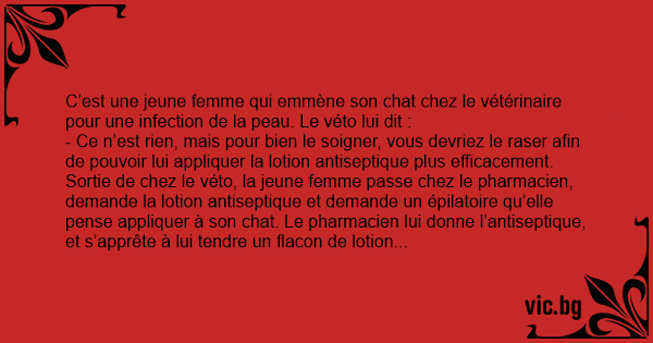 Sortie de chez le véto, la jeune femme passe chez le pharmacien, demande la lotion antiseptique et demande un épilatoire qu’elle pense appliquer à son chat. Le pharmacien lui donne l’antiseptique, et s’apprête à lui tendre un flacon de lotion épilatoire tout en lui lisant le mode d’emploi :