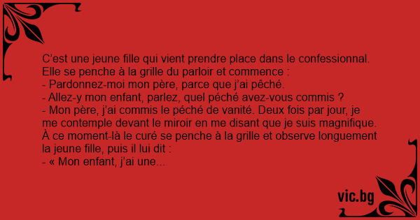 - Mon père, j’ai commis le péché de vanité. Deux fois par jour, je me contemple devant le miroir en me disant que je suis magnifique.