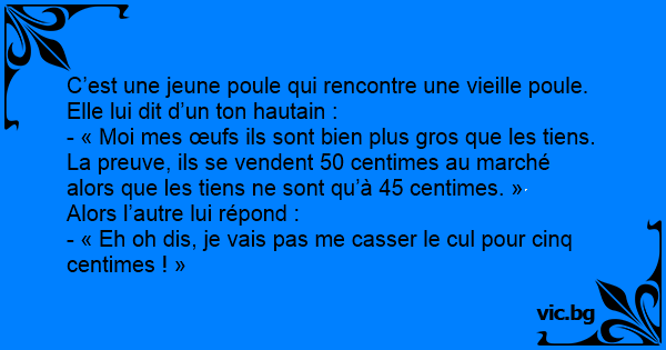 C’est une jeune poule qui rencontre une vieille poule. Elle lui dit d’un ton hautain :