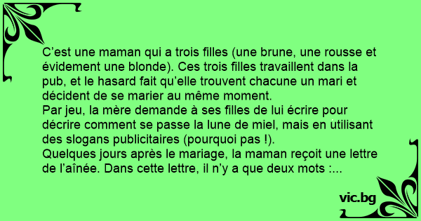 Quelques jours après le mariage, la maman reçoit une lettre de l’aînée. Dans cette lettre, il n’y a que deux mots :