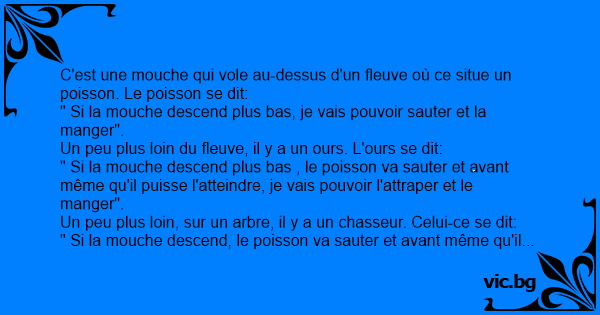 C'est une mouche qui vole au-dessus d'un fleuve où ce situe un poisson. Le poisson se dit:
