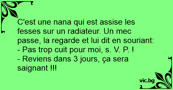 C'est une nana qui est assise les fesses sur un radiateur. Un mec passe, la regarde et lui dit en souriant: