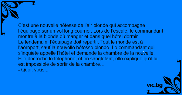 C’est une nouvelle hôtesse de l’air blonde qui accompagne l’équipage sur un vol long courrier. Lors de l’escale, le commandant montre à la blonde où manger et dans quel hôtel dormir.