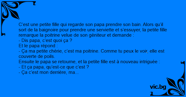 C’est une petite fille qui regarde son papa prendre son bain. Alors qu’il sort de la baignoire pour prendre une serviette et s’essuyer, la petite fille remarque la poitrine velue de son géniteur et demande :