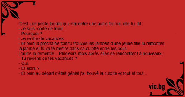 C'est une petite fourmi qui rencontre une autre fourmi, elle lui dit :