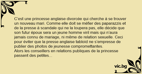 C’est une princesse anglaise divorcée qui cherche à se trouver un nouveau mari. Comme elle doit se méfier des paparazzis et de la presse à scandale qui ne la loupera pas, elle décide que son futur époux sera un jeune homme viril mais qui n’aura jamais connu de mariage, ni même de relation sexuelle. Ceci pour éviter que la presse anglaise tabloïd ne s’empresse de publier des photos de jeunesse compromettantes.