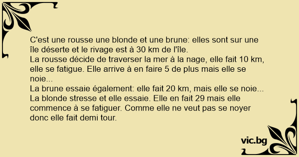 C'est une rousse une blonde et une brune: elles sont sur une île déserte et le rivage est à 30 km de l'île.