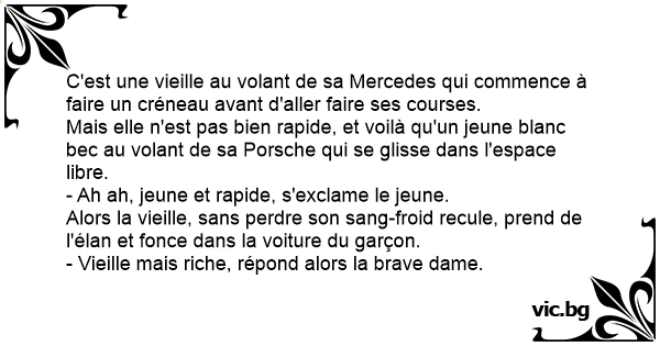 C'est une vieille au volant de sa Mercedes qui commence à faire un créneau avant d'aller faire ses courses.