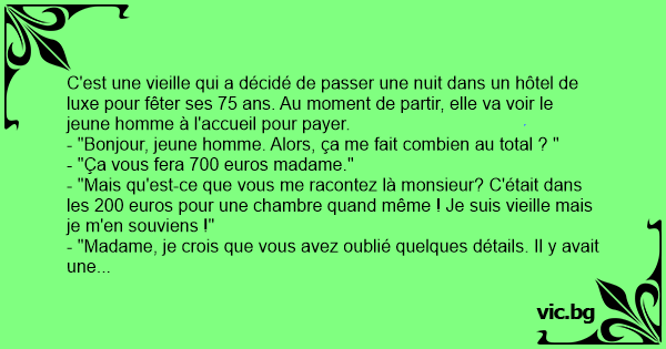 C'est une vieille qui a décidé de passer une nuit dans un hôtel de luxe pour fêter ses 75 ans. Au moment de partir, elle va voir le jeune homme à l'accueil pour payer.