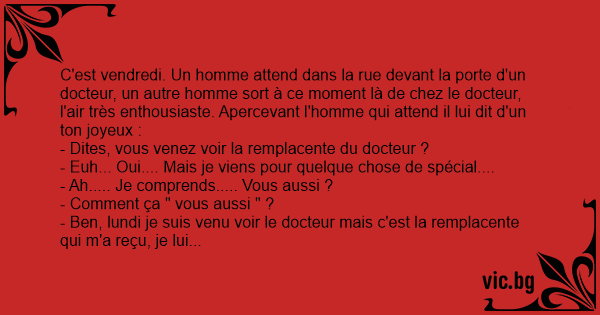 - Ben, lundi je suis venu voir le docteur mais c'est la remplacente qui m'a reçu, je lui ai dit que je venais pour quelque chose de spécial, en fait j'ai des problèmes d'érection et elle m'a donné un médicament. Mardi je suis revenu en lui disant que le médicament avait fonctionné, elle a voulu vérifé et m'a proposé de faire l'amour et devant mon endurance, elle était tellement conquise que depuis 3 jours je revient la voir tout les soirs et on recommence, il faut dire que c'est une vrai chaudasse, elle m'a dit qu'elle avait fait ça plusieurs fois déjà, mais ça me dérange pas. Alors vous me dites que vous venez pour "quelque chose de spécial " j'en conclu que vous avez le même problème que moi ?