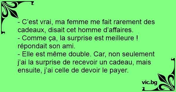 - Elle est même double. Car, non seulement j’ai la surprise de recevoir un cadeau, mais ensuite, j’ai celle de devoir le payer.