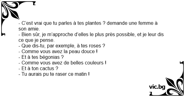 - C’est vrai que tu parles à tes plantes ? demande une femme à son amie.